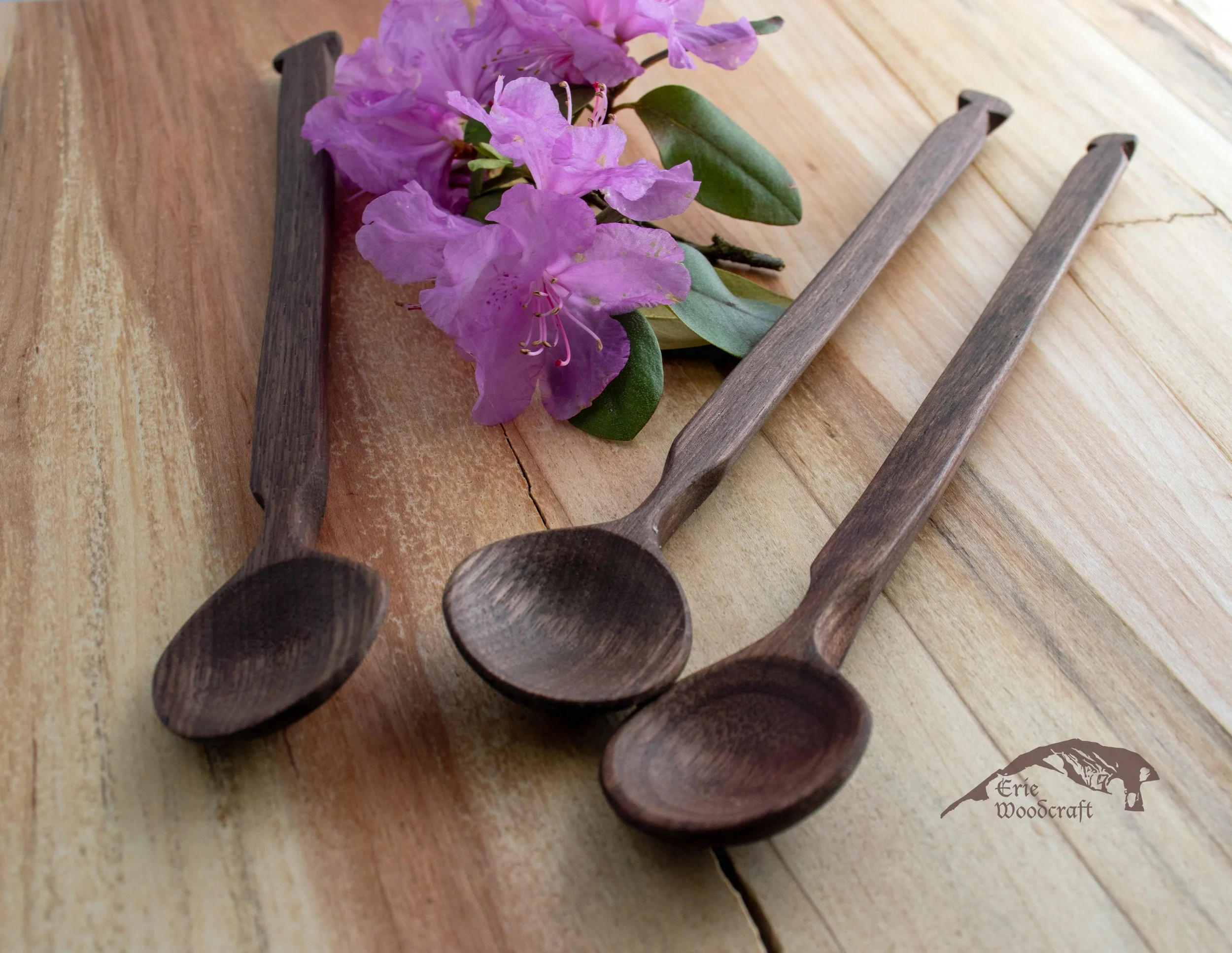 Handcrafted wooden spoon with a dark finish on a wooden surface, next to a white flower and green leaves.